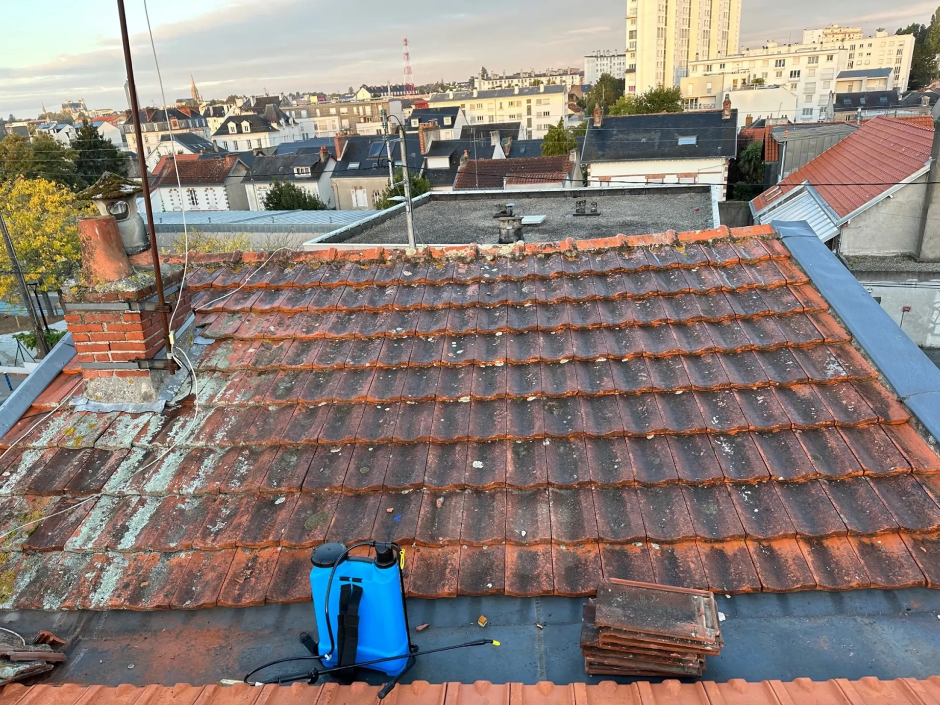 Nous avons appliquer sur les tuiles un nettoyant spécial tuiles anti mousse anti lichen, anti oxyde de carbone.