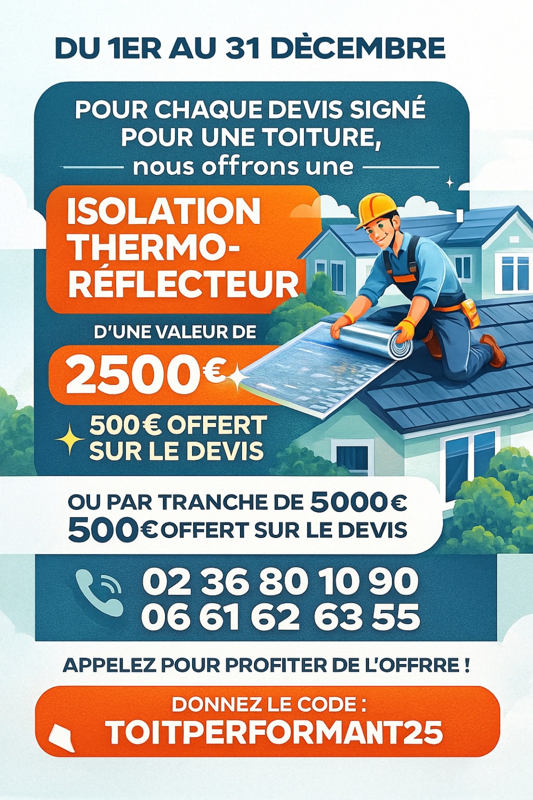 C’est le moment idéal pour réaliser vos travaux de toiture ! Du 1er au 31 décembre, nous lançons une offre exceptionnelle qui va transformer votre projet en véritable opportunité. Pour chaque devis signé pour une toiture, nous vous offrons une isolation thermo-réflecteur d’une valeur de 2 500 €, un cadeau qui améliore immédiatement la performance thermique de votre habitation. Ce système innovant réduit les pertes d’énergie, améliore le confort intérieur et vous aide à diminuer vos factures de chauffage.